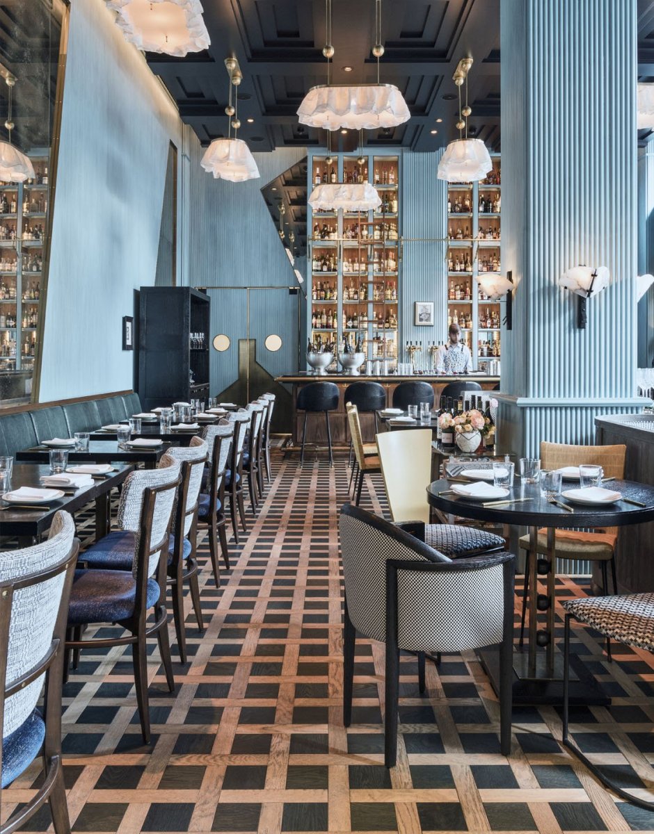 The main dining room is home to a custom marble and walnut bar with a statement brass spirits library. The restaurant’s colour palette is a chic and welcoming light blue and black and accented with wood, stone, metals and glass.