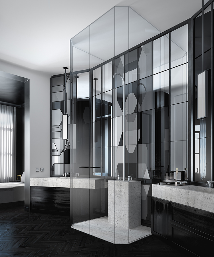 The combination of stunning materials such as Cote D’Azur marble, oak herringbone floors and titanium granite along with the steel floor to celling windows which invite an abundance of natural light, and details such as freestanding tubs and restrained decor make this home bright, inviting and chic.