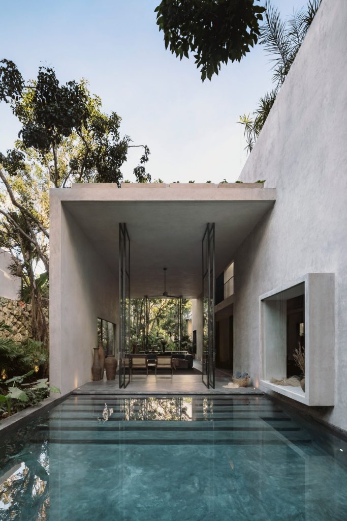 The 330 square metre home is located on the Yucatan Peninsula along the Caribbean coastline. Oriented east to west to take advantage of the prevailing winds and cross ventilation, this rental home was built with low maintanence durability in mind. I love the simple design choices such as hand polish cement covering the concrete walls and the double height ceiling in the living and dining area along with the black terrazzo flooring. My absolute favourite part of this home are the pivoting glass doors that open to create flow from the living area to small but gorgeous swimming pool and garden.