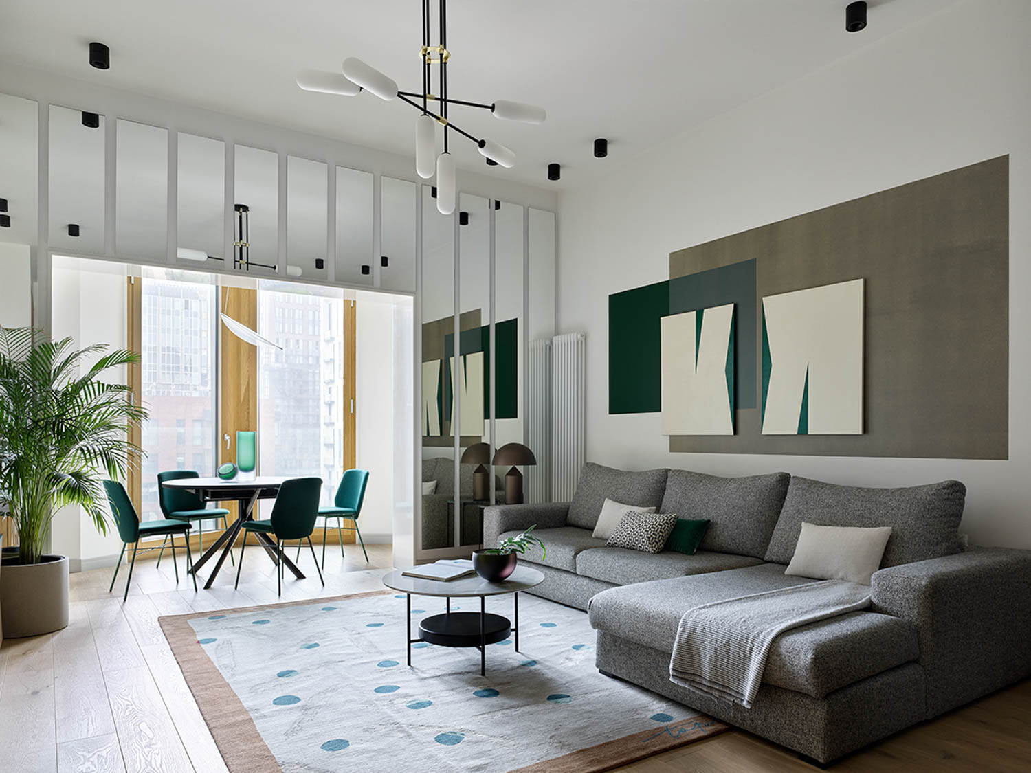 I hope that your 2022 is off to a great start! Today’s featured project first captured my attention by showcasing one of my favourite colours throughout the home. Located in Moscow, this apartment is intelligently designed by Natalia Vologdina-Anikina to suit the lifestyle needs of both adults and children. As requested by her clients, Ms. Vologdina-Anikina used an emerald jewel tone colour throughout the home, helping to elevate the apartments luxe factor. From the dining room chairs to cladding in the master bedroom and a geometric art feature in the living room, the colour was seamlessly integrated throughout the home.